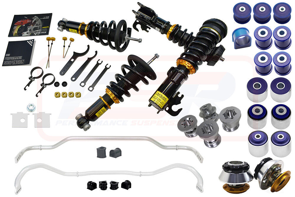 KIT CONTENTS: XYZ Coilovers, PSRCOM-002, PSRCOM-006, Radius Arm bushes, Rear Upper Inner Bushes, Lower-Inner Bush Kit, Caster Offset Plates, Front and Rear Sway Bars, Steering Rack & Pinion Mount Bush Kit, Differential to Subframe Mount Bush Kit, Trailing Arm Bush Kit