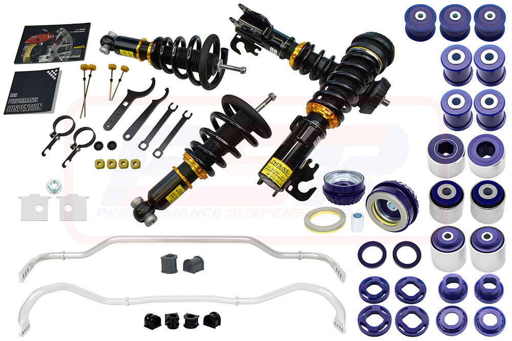 KIT CONTENTS: XYZ Coilovers, Cradle Bush Inserts, Radius Arm bushes, Rear Upper Inner Bushes, Lower-Inner Bush Kit, Caster Offset Plates, Front and Rear Sway Bars, Strut Top & Bearing, Differential to Subframe Mount Bush Kit, Trailing Arm Bush Kit