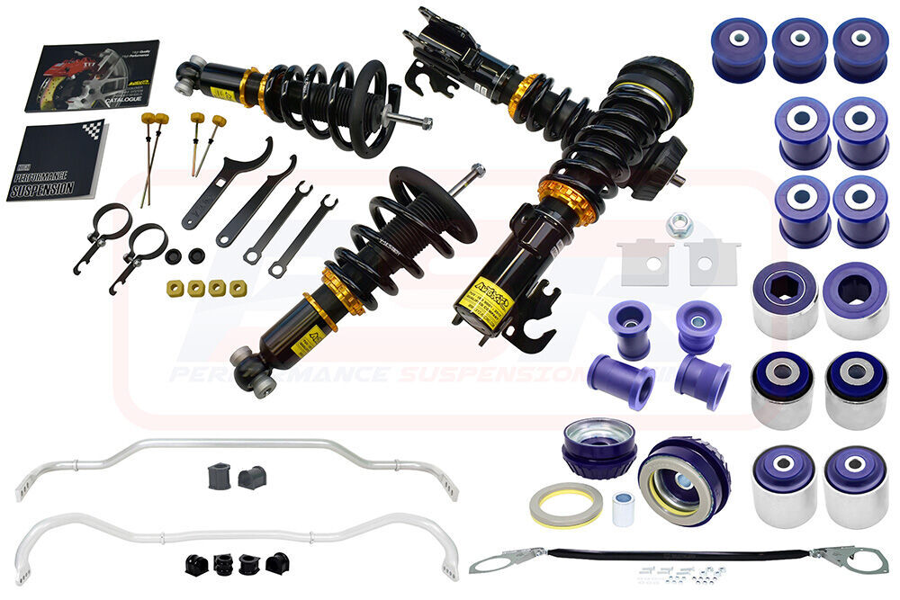 KIT CONTENTS: XYZ Coilovers, Subframe to Chassis Mount Bush Kit, Radius Arm bushes, Rear Upper Inner Bushes, Lower-Inner Bush Kit, Caster Offset Plates, Front and Rear Sway Bars, Strut Top & Bearing, Differential to Subframe Mount Bush Kit, Trailing Arm Bush Kit, Front Strut Brace