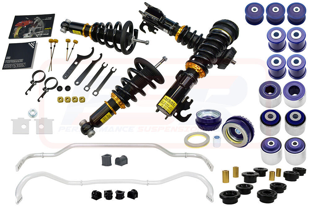 KIT CONTENTS: XYZ Coilovers, Cradle Bushes, Radius Arm bushes, Rear Upper Inner Bushes, Lower-Inner Bush Kit, Caster Offset Plates, Front and Rear Sway Bars, Strut Top & Bearing, Differential to Subframe Mount Bush Kit, Trailing Arm Bush Kit