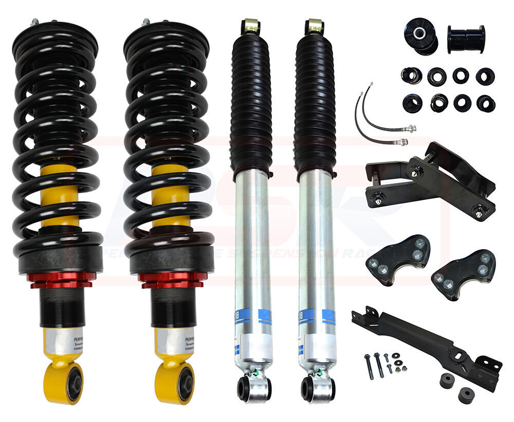 This system sits at 2" front and rear and includes our PSR Bilstein 2 - 4" height adjustable struts all pre-assembled with PSR Coil Springs and HD strut top mounts, PSR ball joint spacer, PSR diff drop, Bilstein Long Travel Rear Shocks, 2" extended greasable shackle, rear extended brake hoses and bush kit.