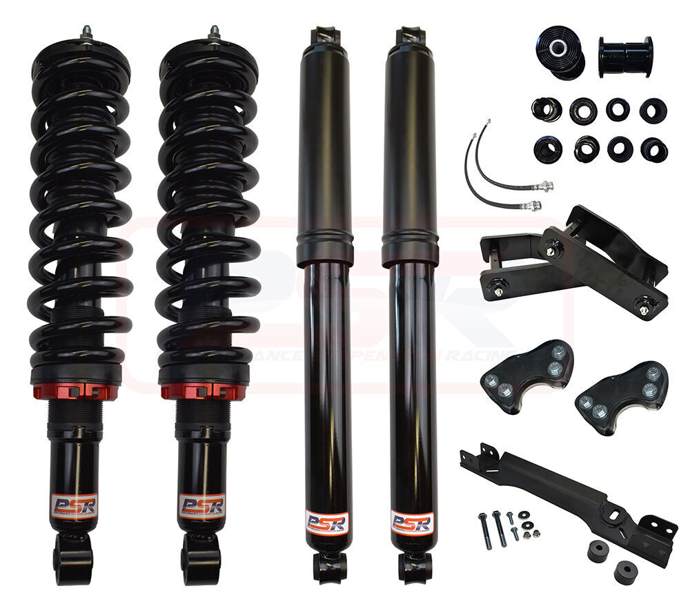 This system sits at 2" front and rear and includes our PSR TTG 2 - 4" height adjustable struts all pre-assembled with PSR coil springs and HD strut top mounts, PSR ball joint spacer, PSR diff drop, PSR TTG Long Travel Rear Shocks, 2" extended greasable shackle, rear extended brake hoses and bush kit.