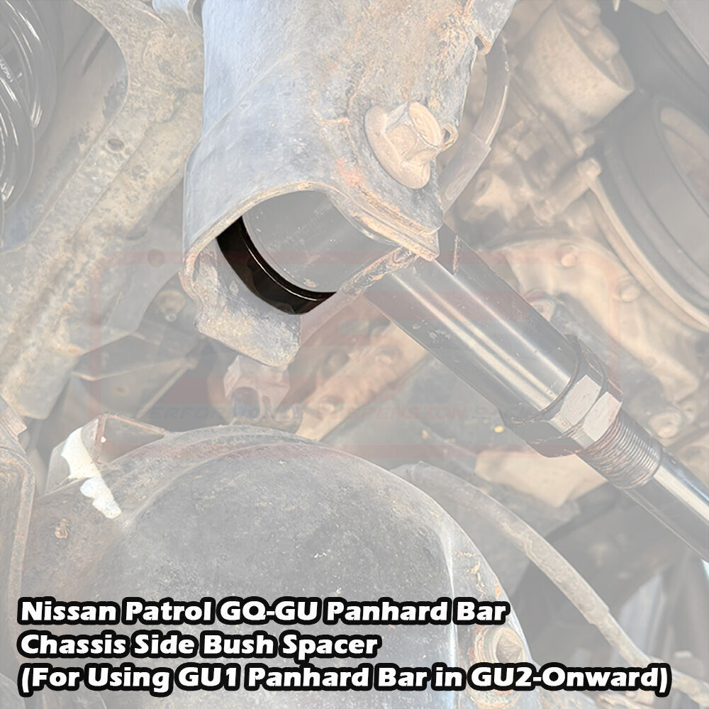 PSR has developed a chassis spacer that allows the earlier non-spherical bearing GQ-GU1 panhard to be fitted and offset forward in the chassis slot, giving the required clearance to avoid contacting the pumpkin or diff guard/brace.